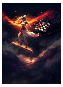 High above the clouds, the racing goddess streaks across the heavens  like comet fire as she triumphantly waves the checkered flag of victory for all the world to see.