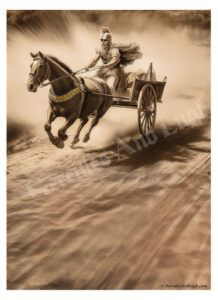 The ancient chariot, once the pinnacle of speed and power, now watches in awe as the sleek racecar blurs past—a thunderbolt of modern engineering challenging the echoes of history.