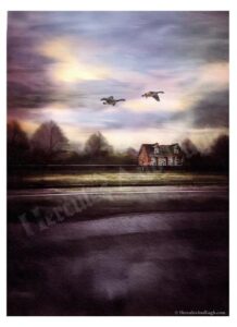 At dawn, the car hummed softly along the winding road, mirroring the silent sweep of geese returning home across a blush-colored sky.